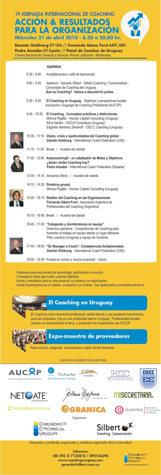 - Organizamos "el" evento anual de Coaching en Uruguay, Jornada internacional de Coaching en Uruguay, que en Abril de este año sorprendió por su nutrida asistencia y calidad de los oradores y esperamos realizar su segunda edición en abril 2011.